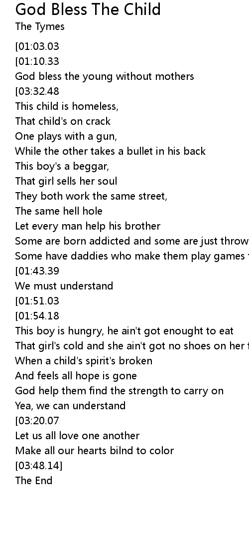 | [03:41.28][01:10.33][00:14.77] | God bless the child who suffers |