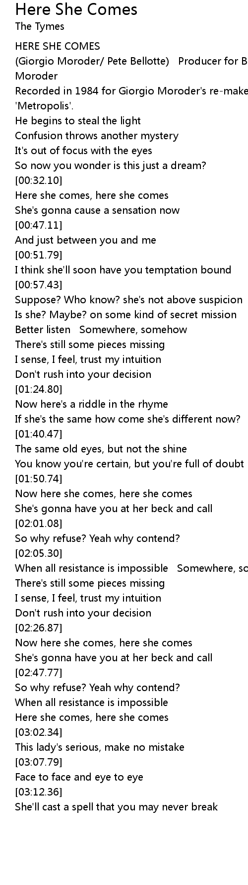 Here she comes, here she comes |