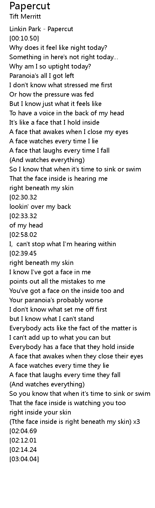| [02:58.56][02:39.45][01:48.43][01:35.39][00:57.17] | It's like the face inside is right beneath my skin |