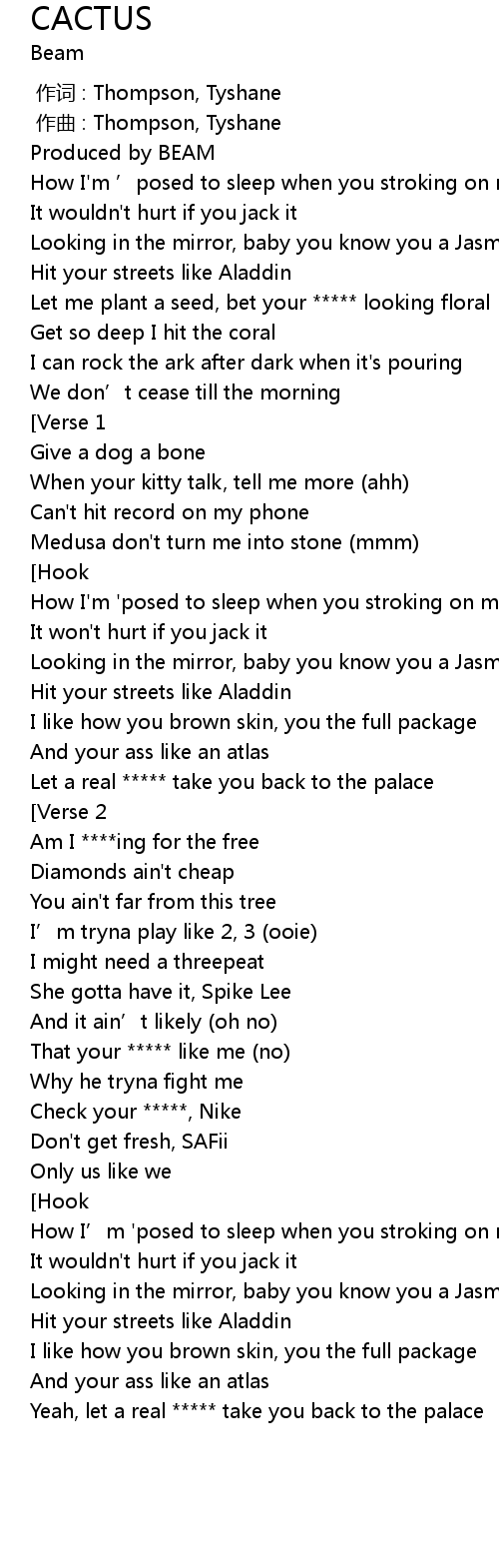 | [01:46.000] | How I' m ' posed to sleep when you stroking on my cactus |