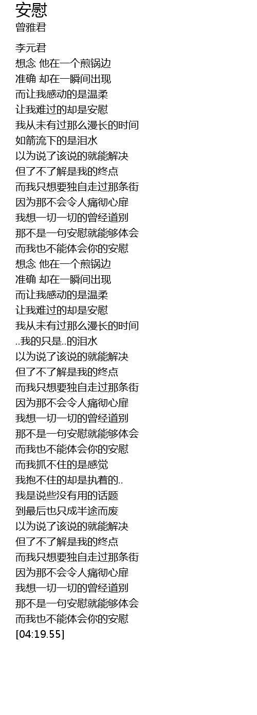 | [04:10.54] | ér wǒ yě bù néng tǐ huì nǐ de ān wèi |