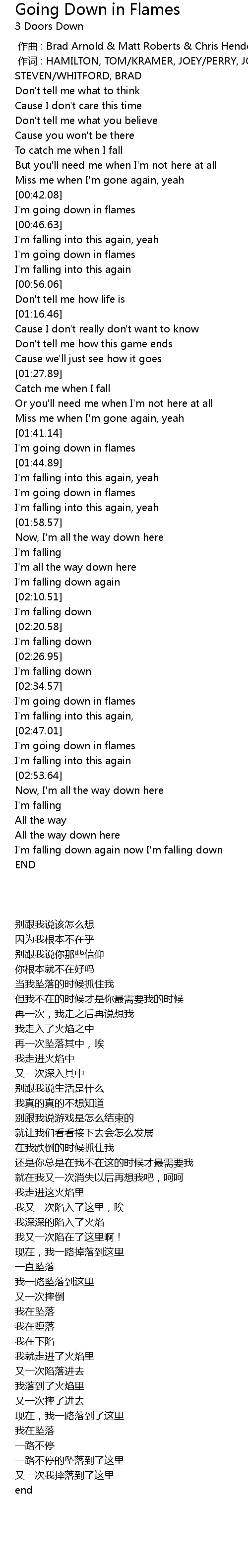 | [01:42.82] | I' m going down in flames |