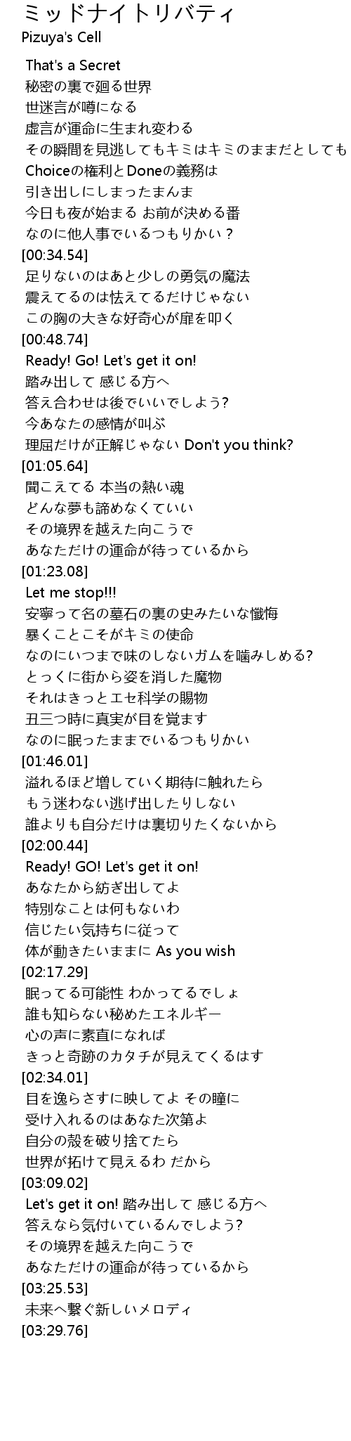| [02:00.74] | Ready! GO! Let's get it on! |