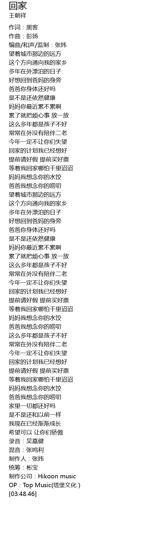 | [01:48.46] | 好想回到爸妈的身旁 |
