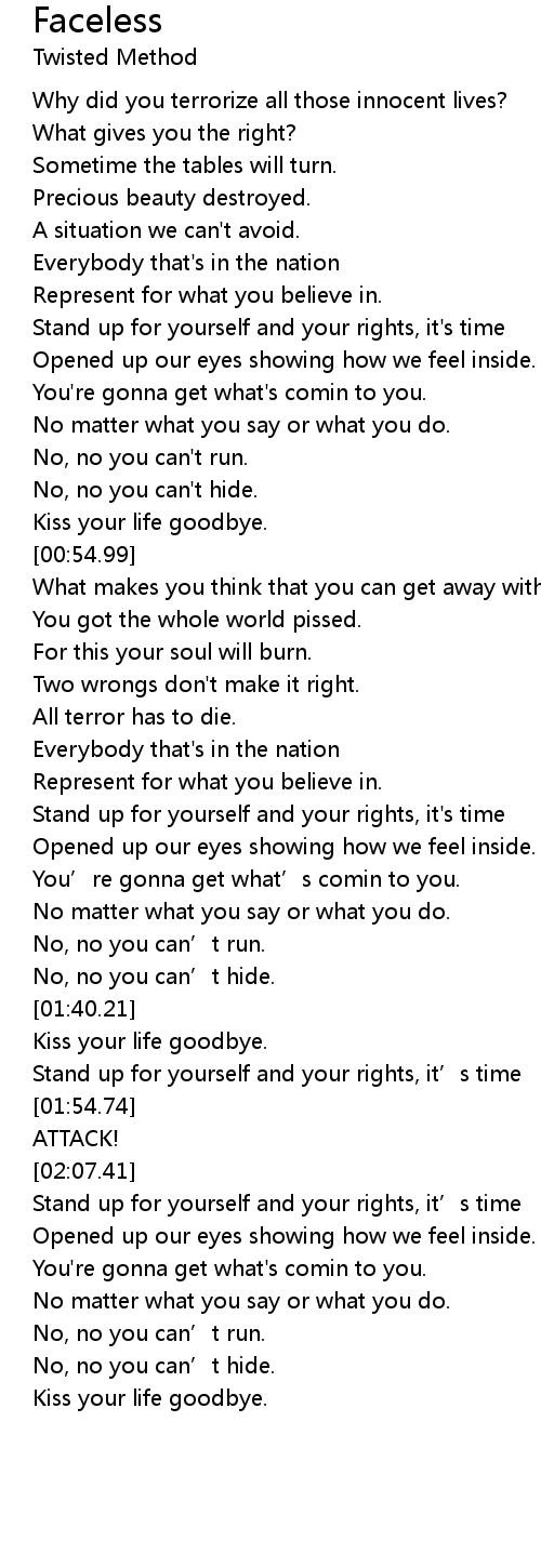 | [00:10.06] | Why did you terrorize all those innocent lives? |