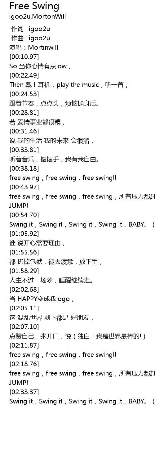 | [00:45.63] | free swing, free swing, free swing, suǒ yǒu yā lì dōu gǎn zǒu! NOW JUMP! |