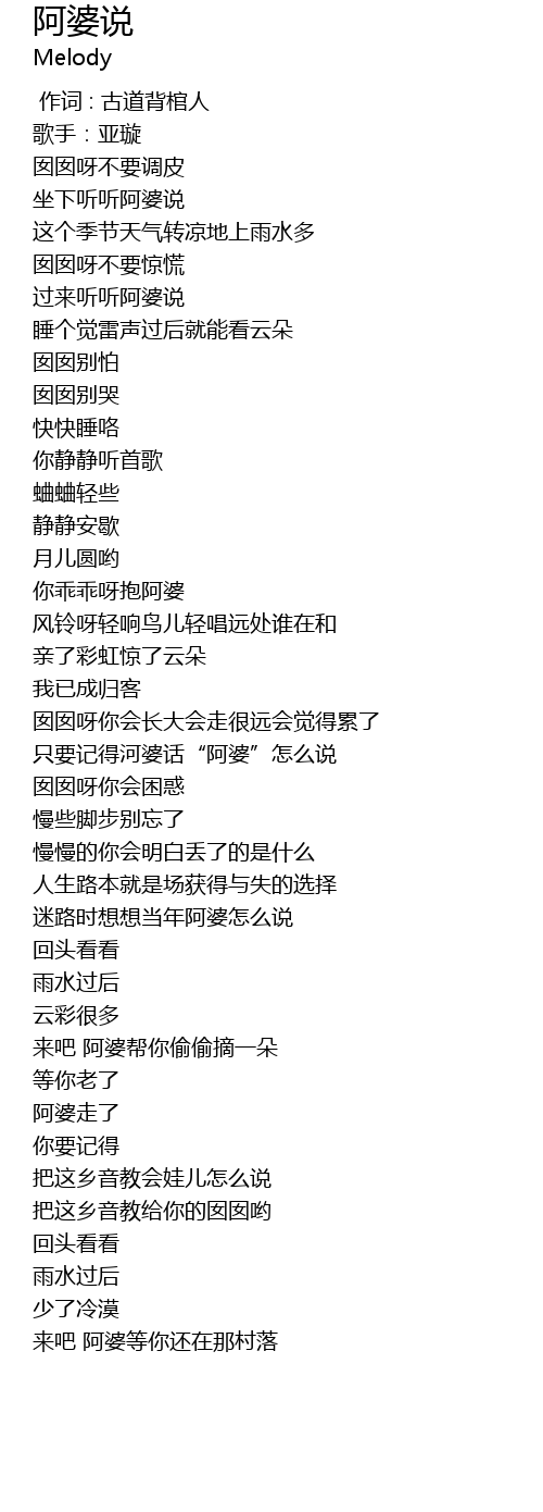 | [00:31.693] | 过来听听阿婆说 |