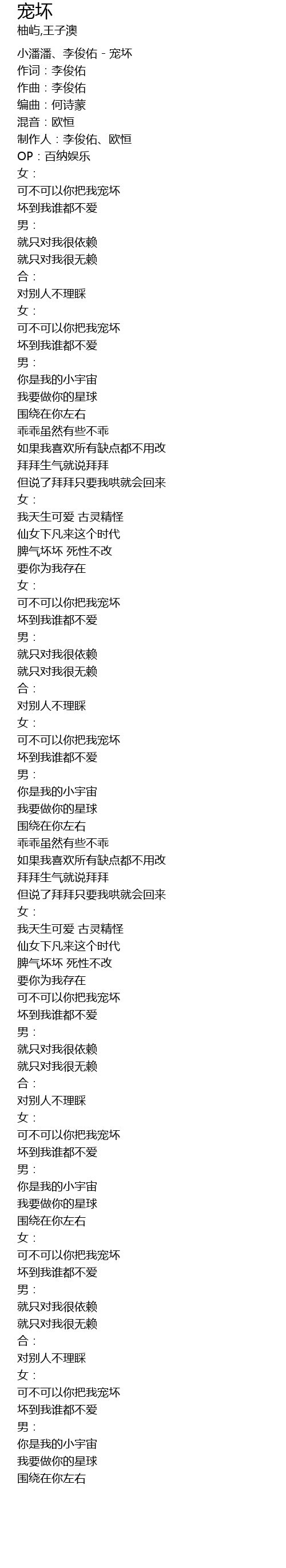| [00:00.00] | 小潘潘、李俊佑 - 宠坏 |