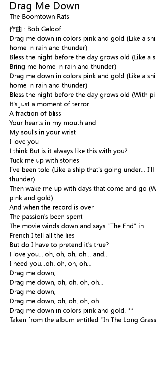 | Drag me down in colors pink and gold Like a ship that' s going under.. Bring me home in rain and thunder | |