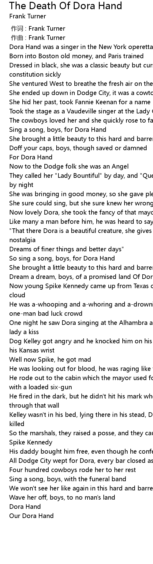 | [00:46.73] | Sing a song, boys, for Dora Hand |