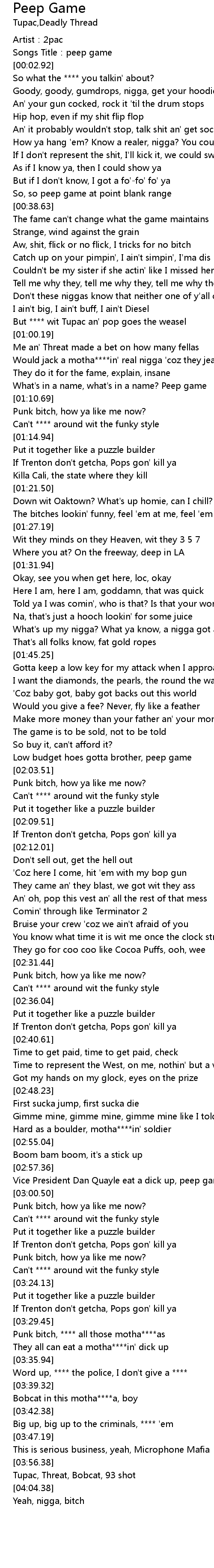 | [00:01.48] | Songs Title:peep game |
