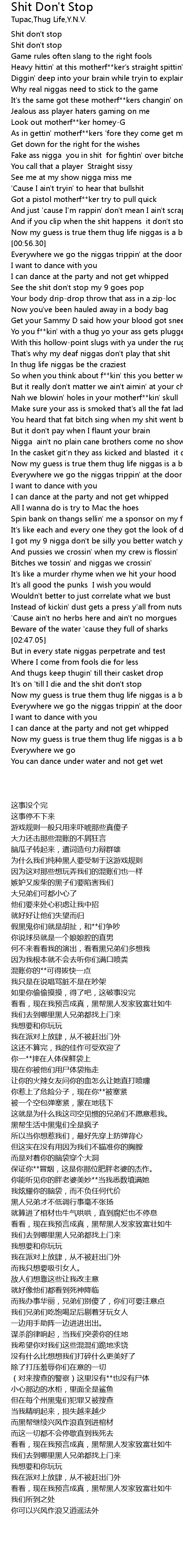 | [00:49.68] | Now my guess is true them thug life niggas is a bull |
