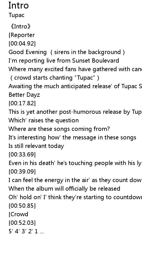 | [00:12.53] | Awaiting the much anticipated release' of Tupac Shakur' s latest album' Better Dayz |