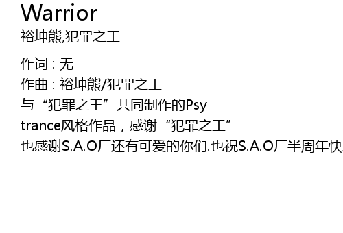 | 与“犯罪之王”共同制作的Psy trance风格作品,感谢“犯罪之王” 也感谢S.A.O厂还有可爱的你们.也祝S.A.O厂半周年快乐! |