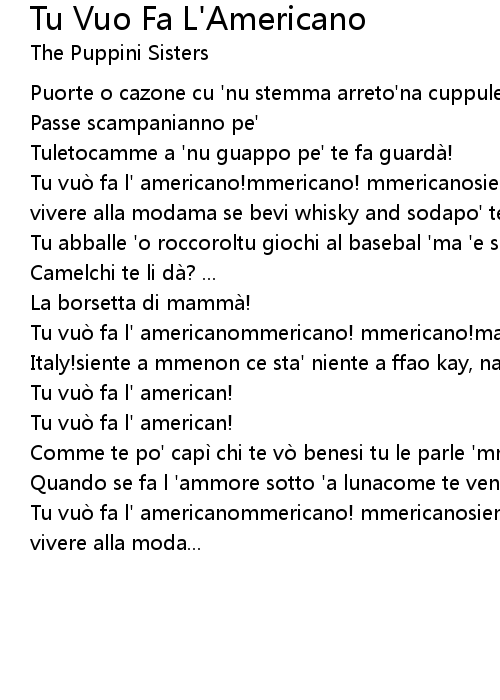 | Tu vuò fa l' americano! mmericano! mmericanosiente a me, chi t' ho fa fa? tu vuoi vivere alla modama se bevi whisky and sodapo' te sente ' e disturbà. | |