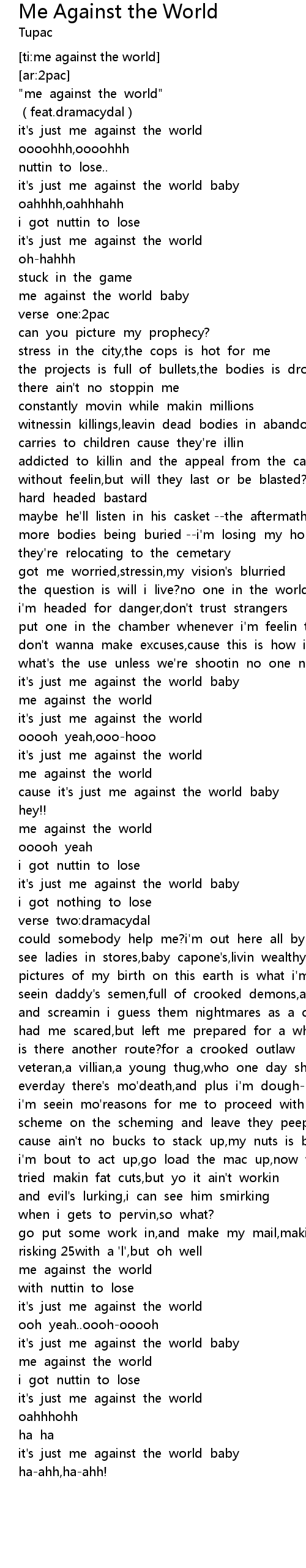 | [00:01.85] | " me against the world" |