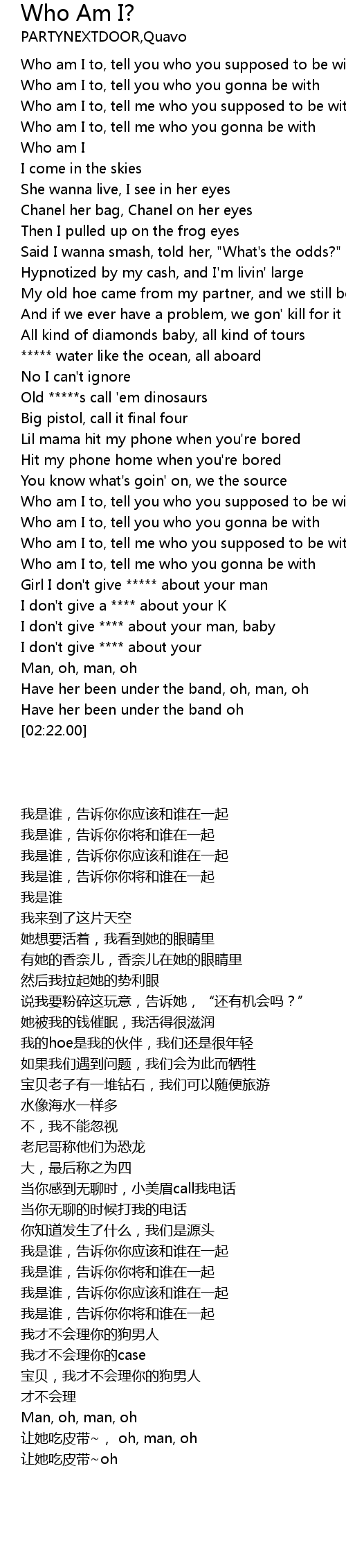 | [01:42.21] | Who am I to, tell me who you supposed to be with |