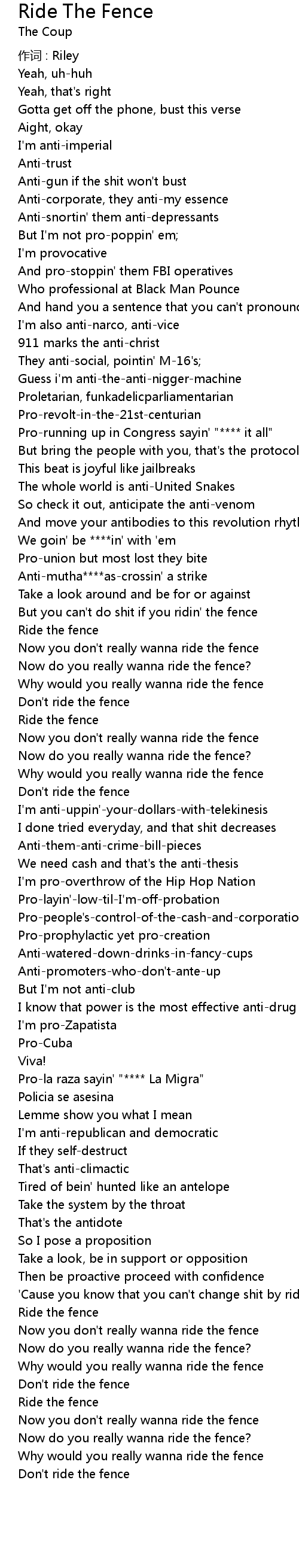 | ' Cause you know that you can' t change shit by ridin' the fence | |