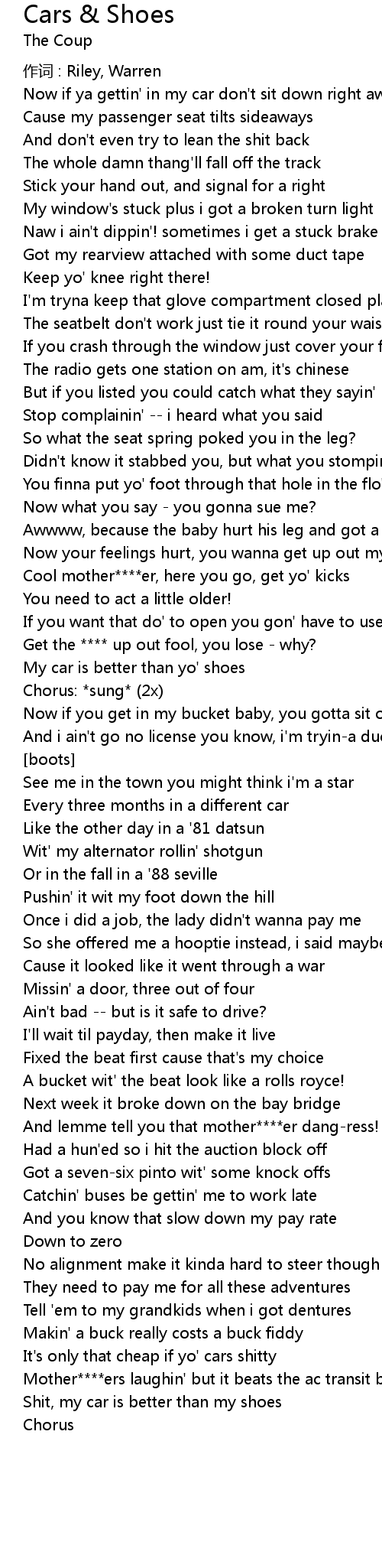 | Now if ya gettin' in my car don' t sit down right away | |