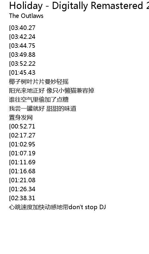 | [03:27.75][02:38.31] | 心跳加快动感地带 Holiday |