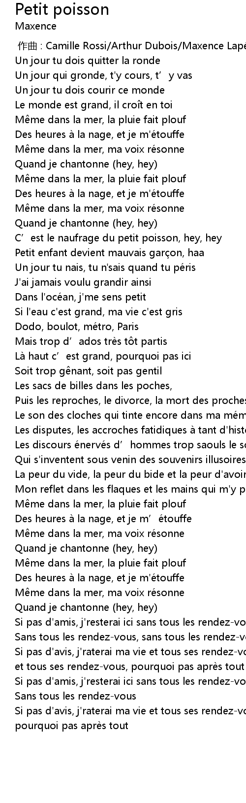 | [00:57.53] | C' est le naufrage du petit poisson, hey, hey |