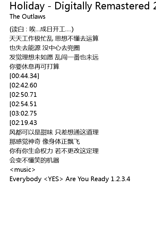 | [03:18.73][02:54.51][02:03.67][00:57.60] | Everybody needs a holiday qù xī qì |