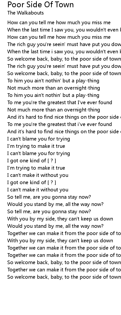 So welcome back, baby, to the poor side of town |