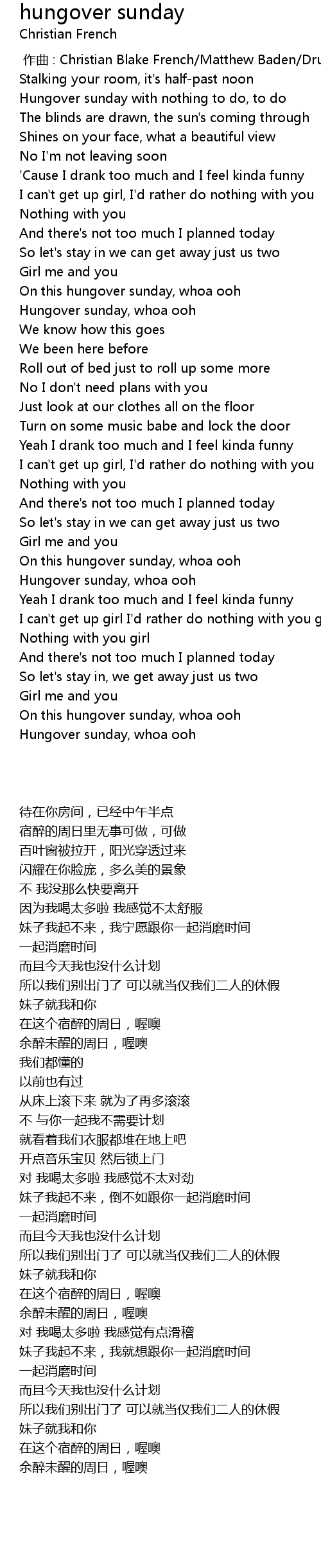 | [02:00.42] | Hungover sunday, whoa ooh |