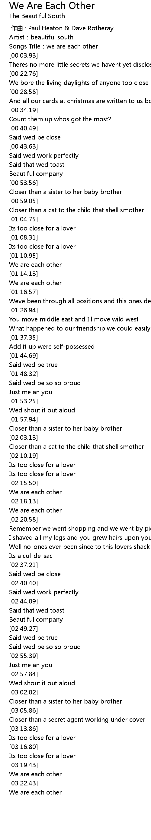 | [00:00.00] | zuo qu : Paul Heaton Dave Rotheray |