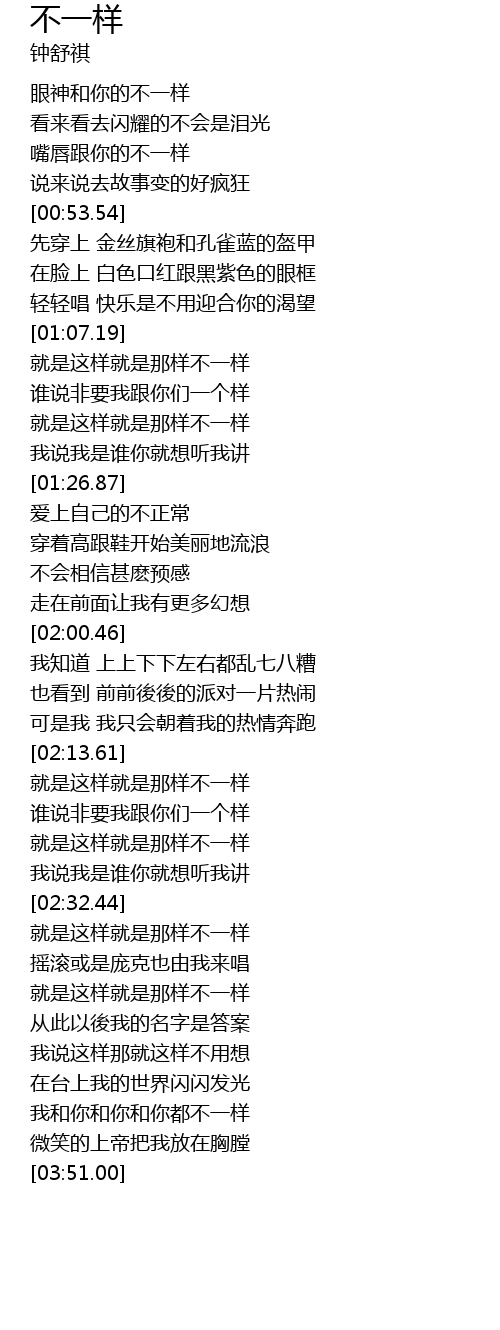 | [03:34.95] | 我和你和你和你都不一样 |