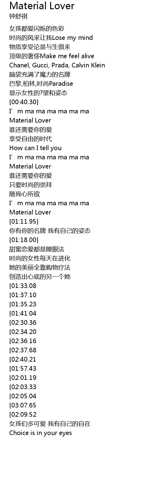 | [01:38.81][01:35.23] | Material Lover |