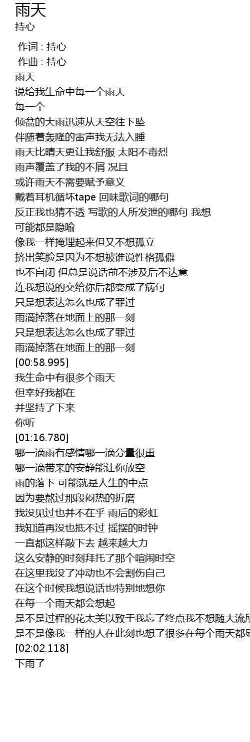 | [01:55.355] | 是不是像我一样的人在此刻也想了很多在每个雨天都显得无比浅薄 |