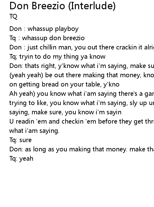 | Ah yeah) you know what i'am saying there's a gang of little breezies out there trying to like, you know what i'm saying, sly up underneath you, you know i'm saying, make sure, you know i'm sayin | |