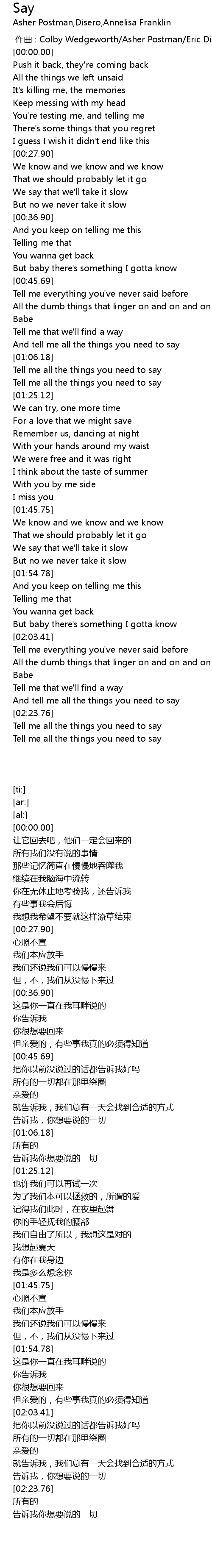 | [00:00.00] | 作曲 : Colby Wedgeworth/Asher Postman/Eric Disero/Annelisa Franklin |