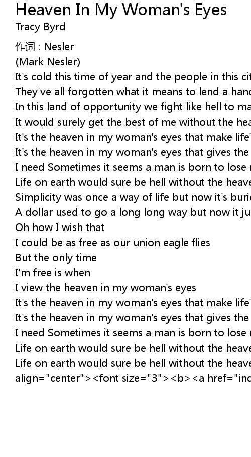 | Life on earth would sure be hell without the heaven in my woman' s eyes p align" center" font size" 3" b a href" index. htm" u |