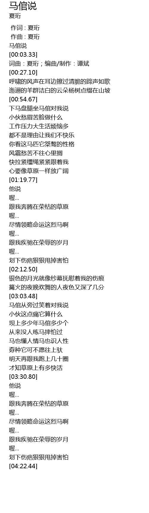 | [03:04.23] | 马倌从旁过笑着对我说 |