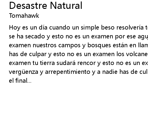 | Hoy es un di a cuando un simple beso resolveri a todo, hacernos olvidar el rio se ha secado y esto no es un examen por ese agujero en mi cielo y esto no es un examen nuestros campos y bosques esta n en llamas de arrepentimiento y a nadie has de culpar y esto no es un examen los volcanes soplan alto y esto no es un examen tu tierra sudara rencor y esto no es un examen la marea no latira con vergü enza y arrepentimiento y a nadie has de culpar y esto no es un examen es el final... |