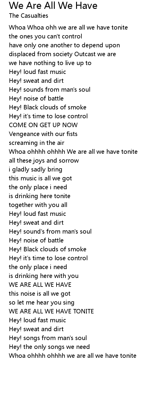Whoa ohhhh ohhhh We are all we have tonite |