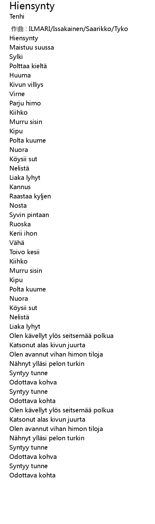 | [00:00.000] | zuo qu : ILMARI Issakainen Saarikko Tyko |