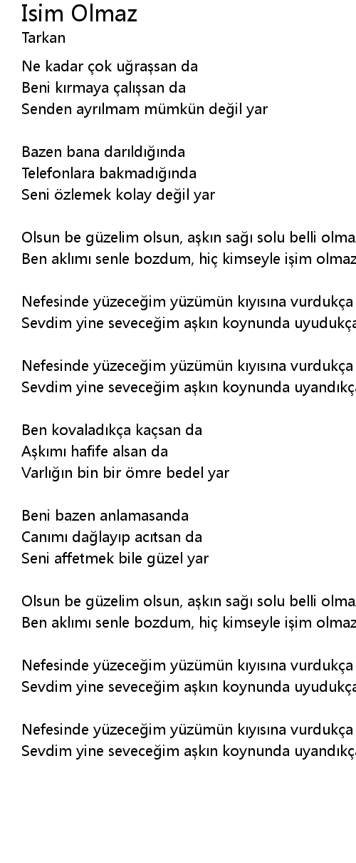 | Olsun be güzelim olsun, aşkın sağı solu belli olmaz | |