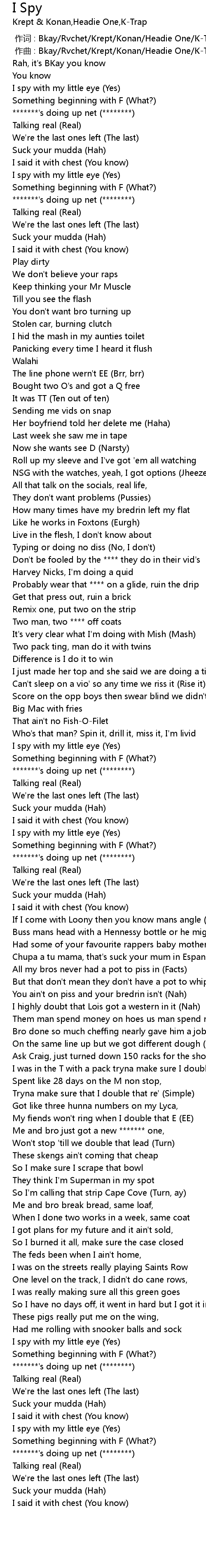 | [00:00.00] | 作词 : Bkay/Rvchet/Krept/Konan/Headie One/K-Trap |
