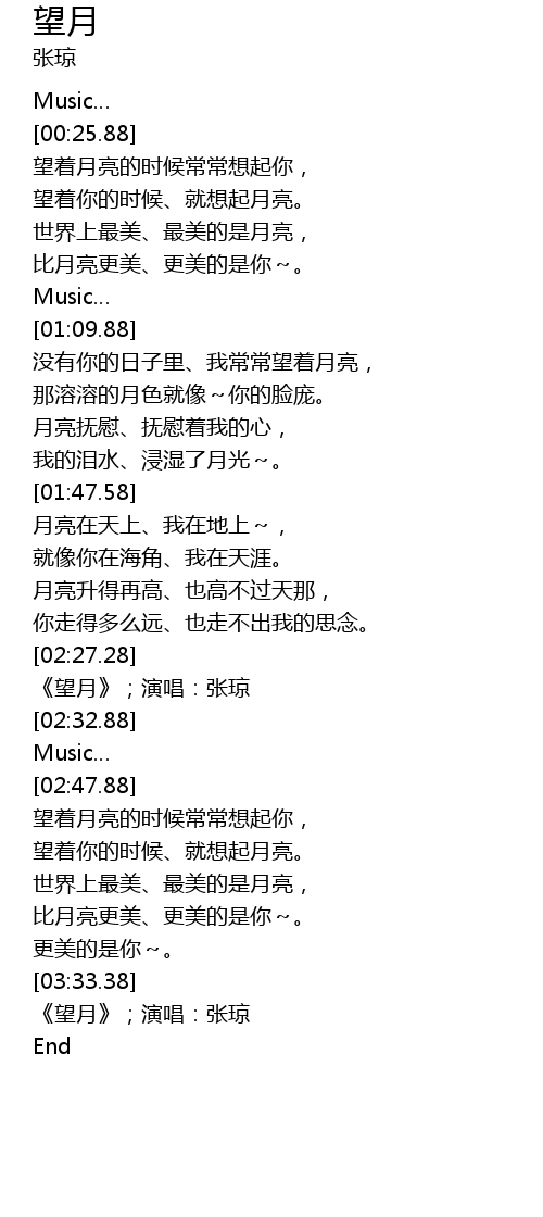 | [03:34.58] | 《望月》;演唱:张琼 |