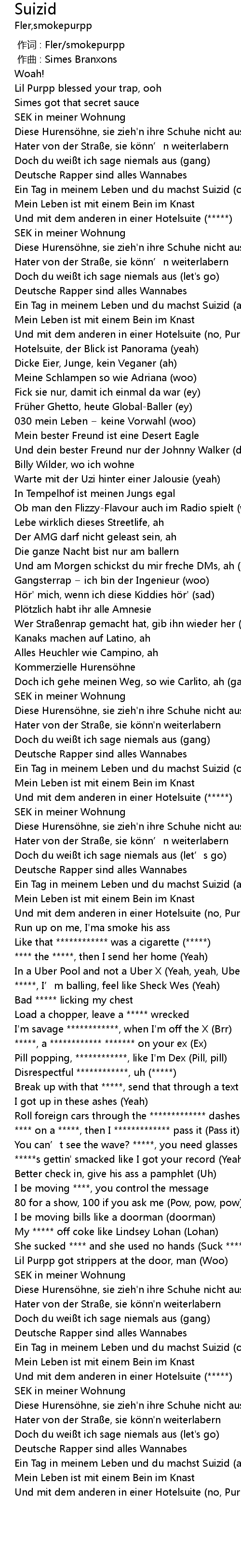| [03:00.81] | Ein Tag in meinem Leben und du machst Suizid (ooh) |