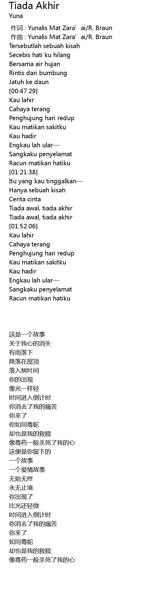 | [00:00.00] | 作词 : Yunalis Mat Zara’ai/R. Braun |