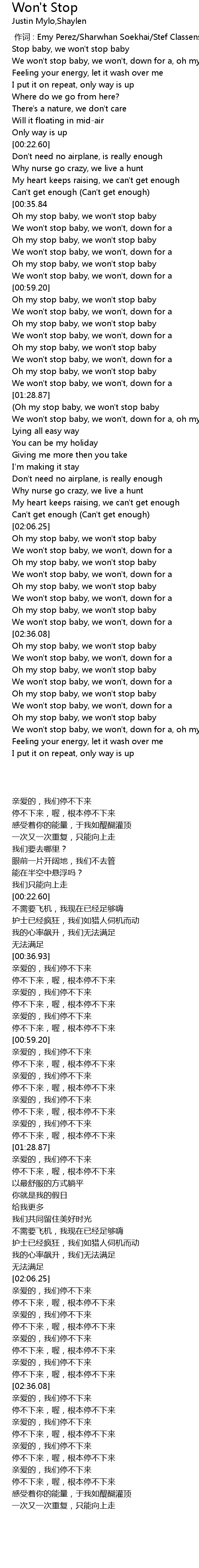 | [01:21.34] | Oh my stop baby, we won't stop baby |