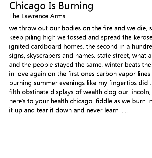 we throw out our bodies on the fire and we die, settle into ashes as the flames keep piling high we tossed and spread the kerosene and alcohol, the ethylene ignited cardboard homes. the second in a hundred and again as many years street signs, skyscrapers and names. state street, what a great street when the places and the people stayed the same. winter beats the summer on the worst ones i fall in love again on the first ones carbon vapor lines burn as a grid like the burning summer evenings like my fingertips did ... this town is choking on our filth obstinate displays of wealth clog our lincoln, wicker, rogers parks. here's to your health chicago. fiddle as we burn. nevermore, nevertheless build it up and tear it down and never learn .....