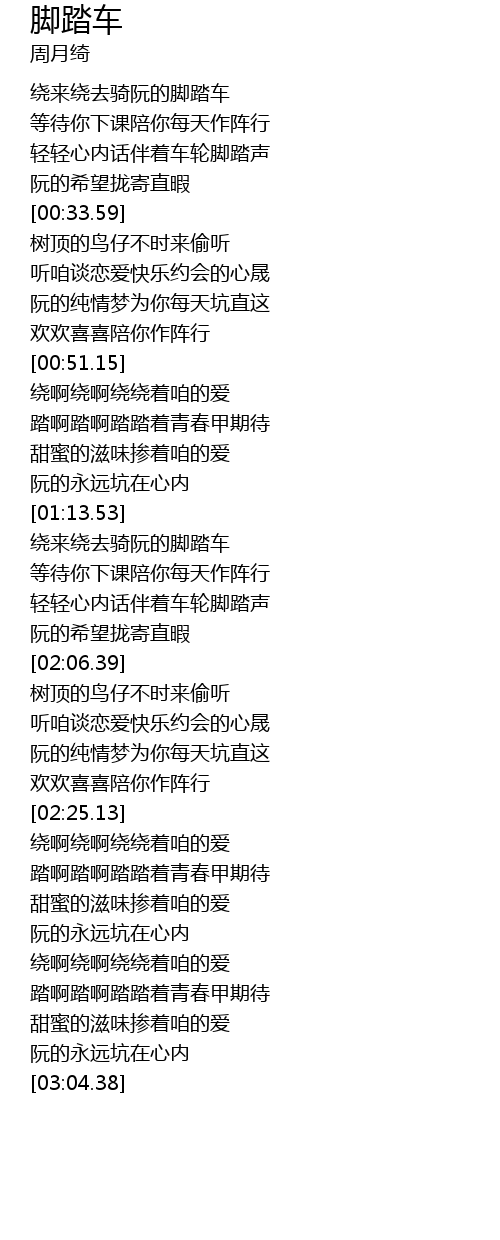 | [00:16.83] | 绕来绕去骑阮的脚踏车 |