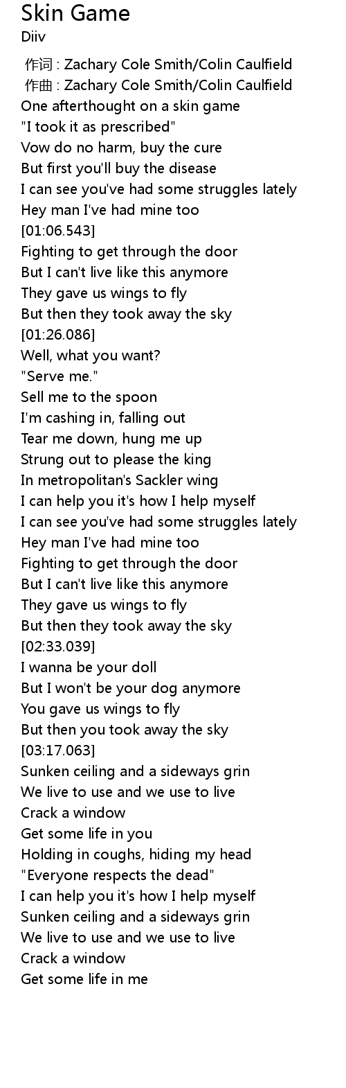 | [03:31.576] | Sunken ceiling and a sideways grin |