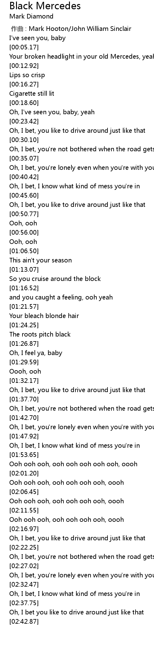 | [00:07.70] | Your broken headlight in your old Mercedes, yeah |