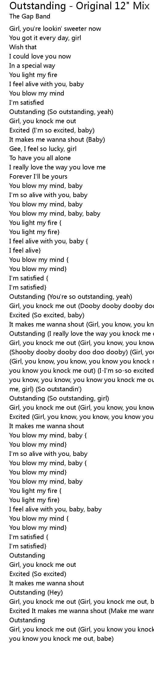 Girl, you knock me out (Girl, you know, you know, you know you knock me out) (Shooby dooby dooby doo doo dooby) (Girl, you knock me out) (So excited, baby) (Girl, you know, you know, you know you knock me out) (Girl, you know, you know, you know you knock me out) (I-I'm so-so excited) (So outstandin', baby) (Girl, you know, you know, you know you knock me out) (I really love the way you love me, girl) (So outstandin') |